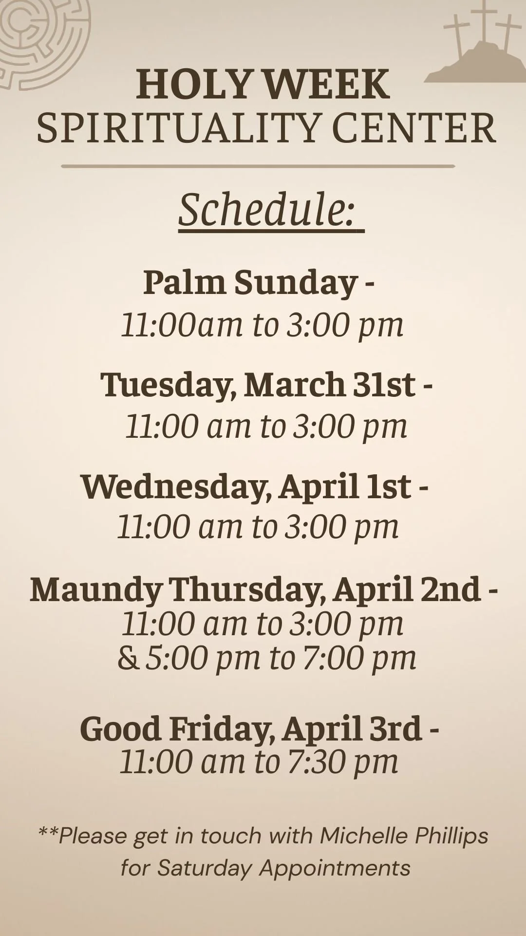 Holy Week & Easter Throughout Holy Week, the Spirituality Center will be open for prayer and quiet reflection. We invite you to spend time in this peaceful space as we prepare our hearts for the celebration of Easter.